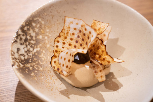 コース料理より、ギネスビールのアイスクリームに、エスプレッソで作ったモラセス(糖蜜)をのせて、牛乳の薄焼きをあしらった新感覚のデザート。