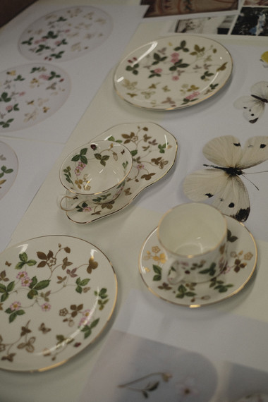 その彼女が手がけたのが、創業260周年を記念してデザインされた、金の装飾をあしらった「ワイルドストロベリー ゴールド」。「260周年というアニバーサリーイヤーにふさわしい商品にするため、ゴールドを使いたいという意向はデザイン段階の初期からありました」とグウィン。縁取りに加え、今回ワイルド ストロベリーのシリーズとしては初めて登場した、蝶のパターンもゴールドで施されている。デザインするうえで最も気遣ったのは、モダンな感覚を取り入れることだったそう。