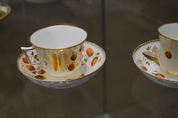 イチゴ柄は長く愛されているパターンのひとつ。左から、ファイン ボーン チャイナ最古のイチゴ柄のカップ&ソーサー(1815年)、デザートプレート(1810-30年頃)。