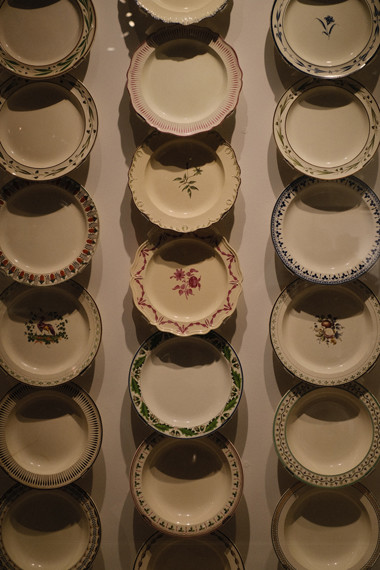 18世紀のパターンブックのデザインが使われているプレート。古さをまったく感じさせないことに驚きを感じる。