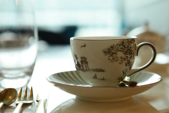 パームコートは、1865年に「アフタヌーンティーが誕生した場所」として知られている。生演奏が流れる美しいサロンで、まるでコースメニューのように、サンドウィッチ、スコーン、ケーキが作りたての状態で順番にサーブされる。伝統的なおいしさの紅茶とスコーン、そしてとびきりスタイリッシュなサンドウィッチとケーキが特徴だ。ここで使われているテーブルウェアはランガムホテルのためにウェッジウッドが特別にデザインしたもの。オーセンティックな中にモダンな感覚を併せ持つアフタヌーンティーを、ウェッジウッドの食器がさらに引き立ててくれた。
