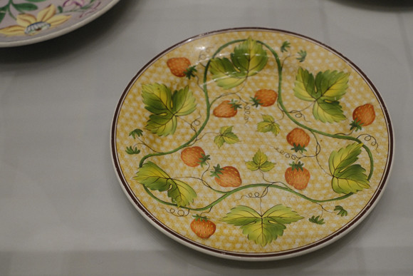 美術館に展示されているワイルド ストロベリーの平皿。このほかにも、さまざまな形のストロベリー柄の食器を発見できる。