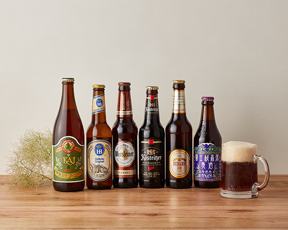 左から、甲斐ドラフトビール ヘレス、ホフブロイ・オリジナル、ヴァルシュタイナー・ドゥンケル、ケストリッツァー シュヴァルツビア、エク 28、富士桜高原麦酒 ラオホ