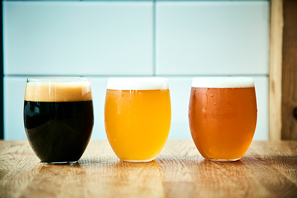 ランチタイム(11:30〜16:30)には「ちびビール」も用意(各¥300)。左から、コーヒースタウトスタイルの「コーヒービール」、ホワイトエールスタイルの「ハナミズキホワイト」、「フタコエール」の3種類。「コーヒービール」の副材料のコーヒー豆は、同じ世田谷の用賀にあるスペシャルティコーヒー専門店「ウッドベリーコーヒーロースターズ」のもの。