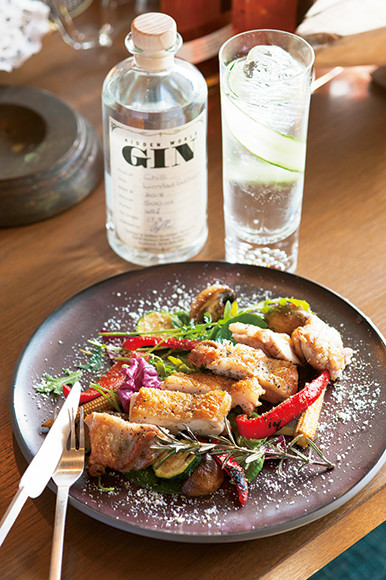 「信州ハーブ鶏モモ肉と彩り野菜のハーブソテー」¥1,944。ニュージーランドのクラフトジン、ヒドゥンワールドを使った「キューカンバージントニック」¥1,512
