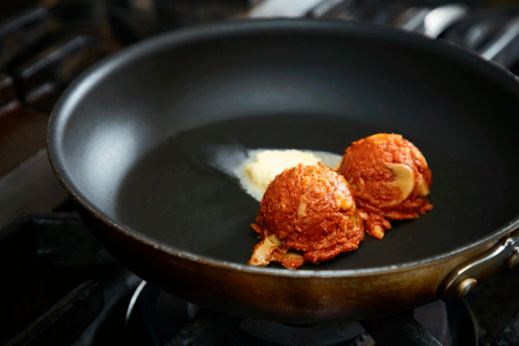 “オムライスの種”と呼ばれる具材はタマネギや大山鶏のもも肉、マッシュルーム、バター、ケチャップなどを水分がなくなるまでしっかりと炒めた“旨味の凝縮体”。この種を温めてから白米とあおり、最後にエダムチーズを入れてコクを出すのも資生堂パーラー流だ。