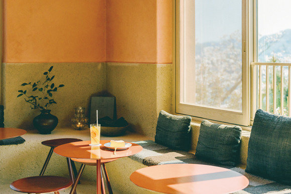 カフェの窓から、尾道の美しい景色が楽しめる。瀬戸田産レモンを使用した「自家製レモネード」¥540、「チーズケーキ」¥518
