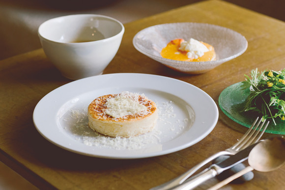 細川亜衣さんが監修したコース仕立ての朝食。瀬戸内産の小麦粉を使用したクランペットには三良坂フロマージュのチーズをたっぷり削って。スープとサラダ、フルーツは季節のものが楽しめる。
