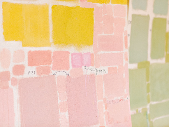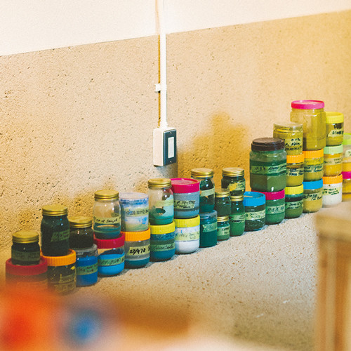 印象的な内装の色は、イギリスのカラーアーティスト、ムイルネ・ケイト・ディニーンが尾道に滞在して作ったという。114色ものカラーレシピのサンプルが。ギャラリーにはログのプロジェクトの軌跡が展示されている。
