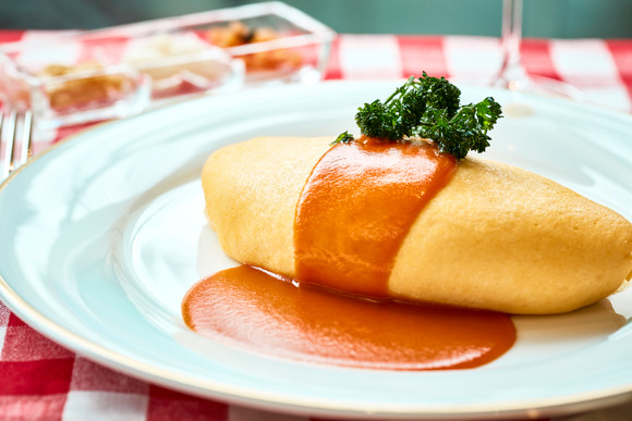 神々しいオーラを放つ、資生堂パーラーのオムライス。 文豪も愛した名店の人気メニューを、新店で味わって。 |