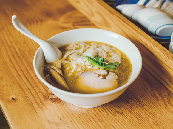 鶏と魚介出汁の醤油ベースの優しい味のラーメン。化学調味料不使用で、なおかつ老舗のお茶屋さんの井戸水を使っているという贅沢なスープだ。スパイスの効いたむっちりとしたワンタン、低温調理法のチャーシューは酒のつまみとして単品で頼むこともできる。「ワンタン麺」¥850