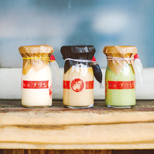 尾道産のたまご、北海道産のてんさい糖で作られたこだわりのプリン。3種類の味が楽しめる。左から尾道プリン(¥324)、珈琲(¥400)、抹茶(¥324)。