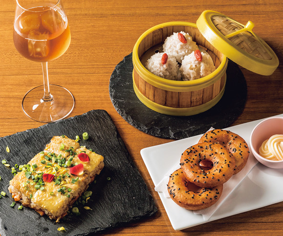手前左から時計回りに、ニンジンやエリンギ、豚肉の入ったおこわを薄焼き卵で挟んだピリ辛味の「ドウピー」¥1,490、皮に見立てた餅米の中に、富士山の伏流水を飲んで育った富士ヶ嶺ポークを包んだ「真珠団子」¥2,030、現地では甘酒と一緒によく食べるという「武漢風米粉ドーナツ」¥734。中国茶はグラス¥624。シェフの出身地である湖北の料理を中心に、エビ餃子など定番の点心も揃えた豊富なメニュー。