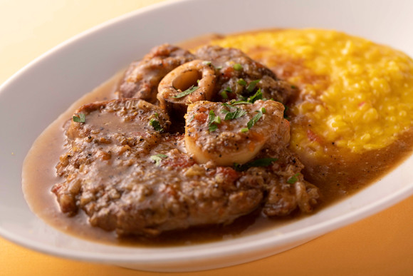 仔牛の骨付きスネ肉を煮込んだミラノの郷土料理。その歴史は古く、中世にまで遡るそうだ。リゾットに使われるサフランは、世界一高級なスパイス。「オッソブーコ アラ ミラネーゼ 仔牛スネ肉の煮込み」¥5,280