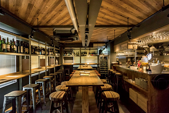 中央に大テーブルとハイスツールを配した店内。23時以降は喫煙可になる。