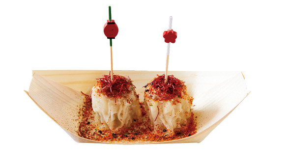 食べ歩き用の木舟に盛った「鳳焼売(紅)」1個¥100(2個から販売)。味付けは糸唐辛子と山椒入りの七味唐辛子。週末は1日で800個販売される。