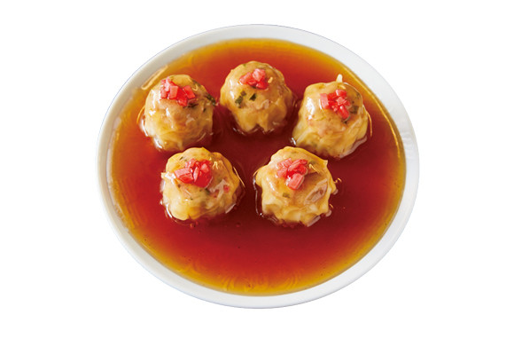 米酢と雑穀酢をブレンドした京甘酢をかけ、国産紅ショウガをのせた「鳳焼売(金)」5個 ¥550。2個から注文可。