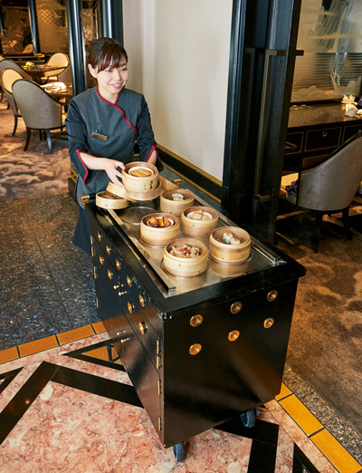 広東料理歴約40年の和栗邦彦を総料理長に迎えて昨年11月にリニューアル。以降大好評を博しているのが平日限定の飲茶オーダービュッフェ。点心師が早朝から仕込む点心は、エビ蒸し餃子や小籠包などの伝統的なものから、モダンな創作点心まで、30種類以上。そのうち約6種類は本場さながらにワゴンでサーブされる。13時30分から始まる90分のオーダービュッフェで、アフタヌーンティー的飲茶を楽しんで。
