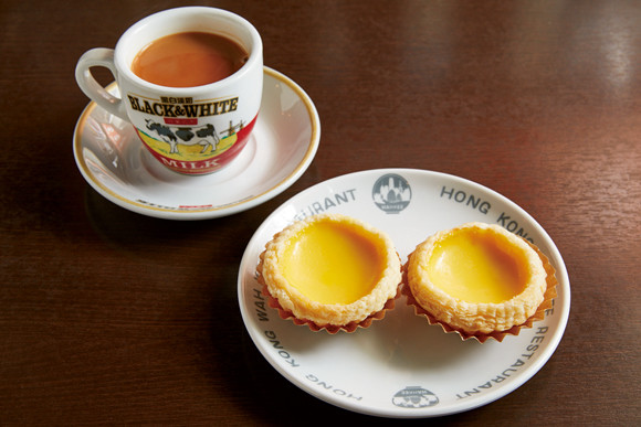 カスタードクリームがたっぷり詰まった「エッグタルト」(各¥216)はテイクアウトも可能。「ミルクティー」(¥480)には香港直輸入の紅茶を使用。