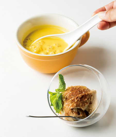 デザートのみの注文もOK 。手前はジャスミン茶とライチの香りが華やかな「ジャスミン茶アイス」¥400。奥はタピオカ、トウモロコシ、ニンジン、ココナッツを使ったデザート「カボチャコーンタピオカ」¥500
