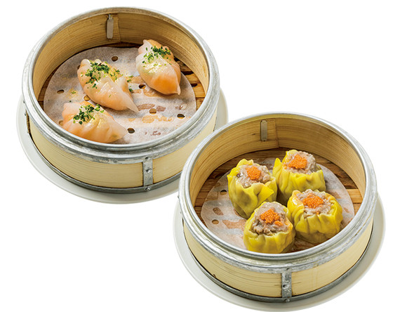 左:創作点心の中でもいちおしな「アスパラとびっこエビ蒸し巻き」¥600 右:卵黄を練り込んだ皮で豚肉とシイタケの餡を包んだ「焼売」¥500