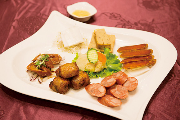 前菜盛り合わせ「六品綜合拼盤」は天然のカラスミや自家製豚の腸詰めなど10種類ほどから4~6品チョイスできる。エビ団子は、豚ひき肉とエビのすり身を、薄く延ばした豚の脂で巻いたもの。エビ団子「手工炸蝦棗」、豚の腸詰め「手工粉腸」、蟹団子「自製蟳丸」、茹でイカ「川燙軟絲」、豚のモツ煮込み「滷大腸頭」、天然カラスミ「野生烏魚子」など。大780元