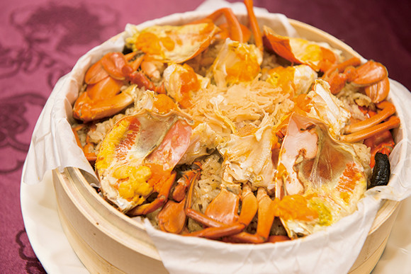蟹おこわ「紅蟳米糕」は甲羅を見せず、裏返して中身を見せる盛り方が特徴。大1,200元