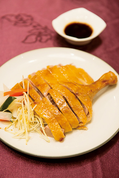 辦桌料理ではよく出る鴨のスモーク「煙燻鴨」。酢醤油につけて。中300元