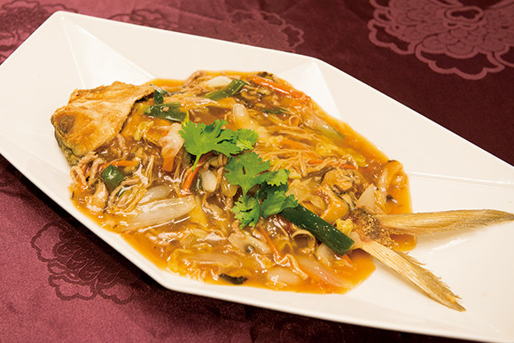 台南の代表魚、サバヒーを使った野菜のあんかけ「虱目魚五柳枝」。サバヒーを姿揚げした豪華な一品。680元