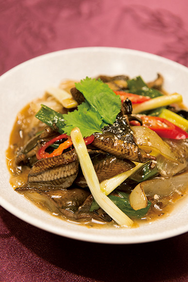 この店の名物、タウナギの炒め物「生炒鱔魚」は、台南では昔から一般的に食べられている家庭料理。淡水魚の一種で、甘めに味付けされる。この店でも出しているが、意麺ともよく一緒に食べられる。中600元