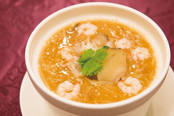 フカヒレの煮込み「紅燒魚翅羹」は、台南らしく少々甘めの味付け。天然エビの火焼蝦が味に深みを加える。中500元