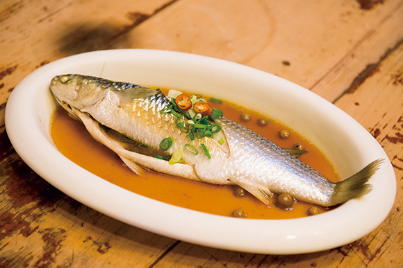 サバヒーの蒸し料理「清蒸豆仔魚」。サバヒーは骨が多いが、尾に近い身は骨がなく食べやすいからと、その部位だけを使ったシェフのアイデアから生まれた。隠し味は關廟産のパイナップル。