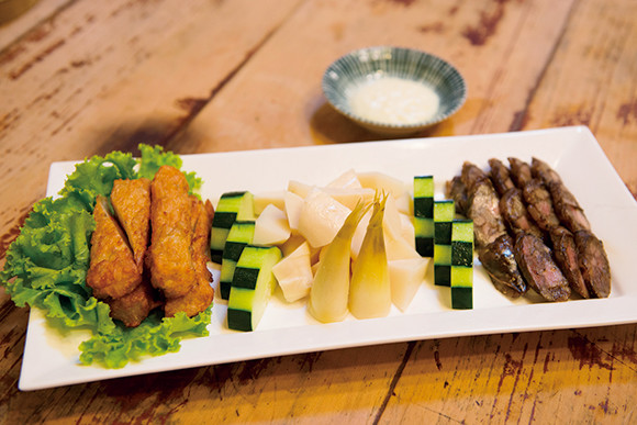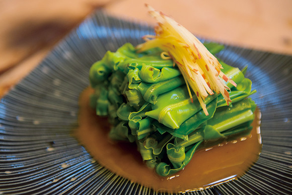 茹で野菜の果実ソースがけ「果香山蘇」。台湾のシダ科の山蘇は台南では一般的。豆腐乳と呼ばれる台湾の調味料に桃を加えたオリジナルのソースでいただく。