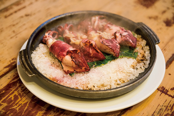 イカの鉄板焼き「鹽焗小卷」は、小卷という小ぶりのイカを厳選。北門産の塩を敷き、紹興酒で香り付けする。
