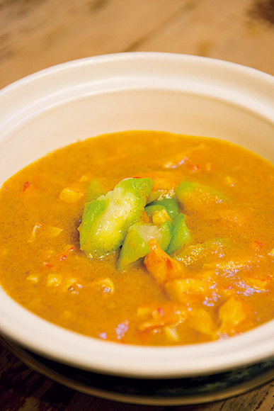蟹肉と蟹みその煮込み「蟹黃絲瓜海鮮」。これから出回るヘチマは台湾離島の澎湖産。熱しても残る食感がアクセントに。