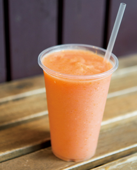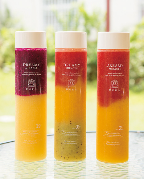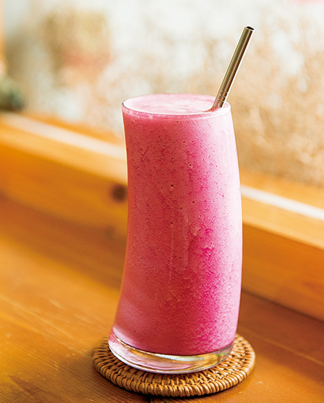 ドラゴンフルーツ、リンゴ、パイナップルにレモンとハチミツを加えたスムージー「紅吱吱」105元。ブルーベリーやオートミールなどが入ったヘルシーな「藍眼睛」やパパイアスムージーにリキュールを加えた変わり種も。