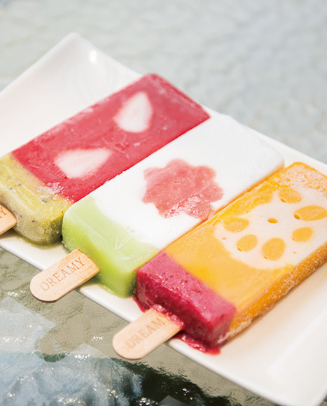 アイスキャンディは常時20種類以上。左から、イチゴ&キウイ「奇異草莓」、スイカ&ココナッツ「恭喜老爺」、マンゴー&イチゴ&レンコン「繽紛夏日」各70元
