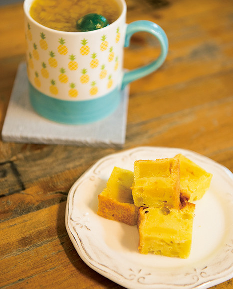 地瓜と呼ばれるサツマイモのケーキ。「地瓜蛋糕」45元。「鳳梨桔茶」とのセットで85元