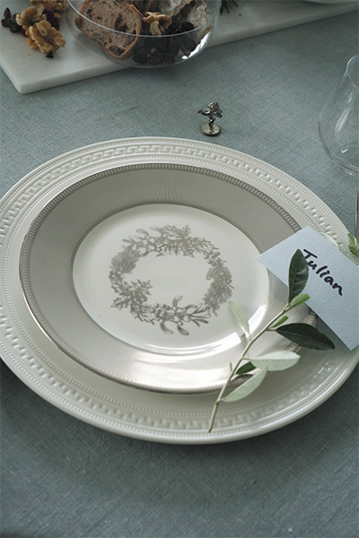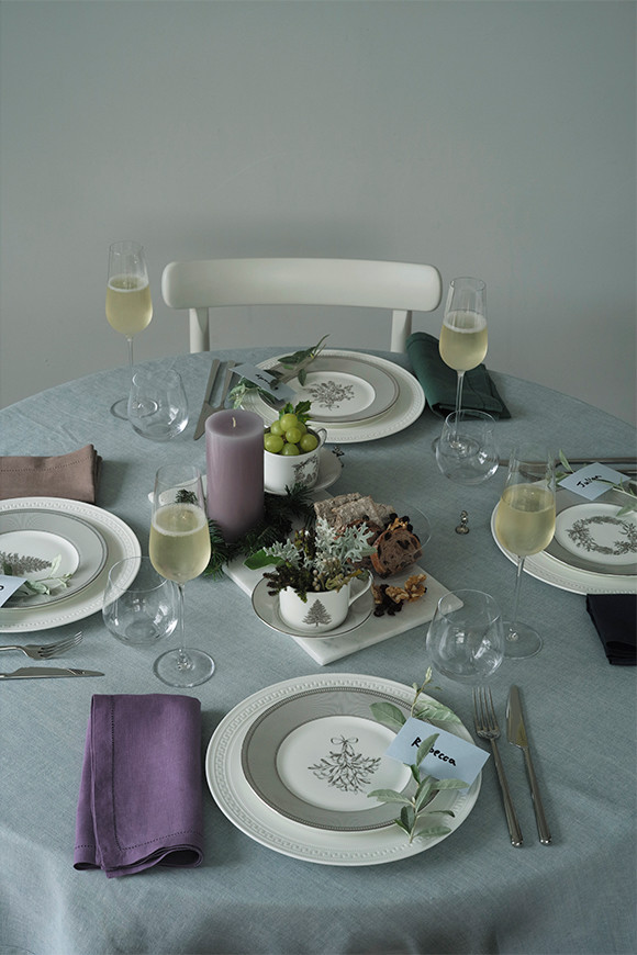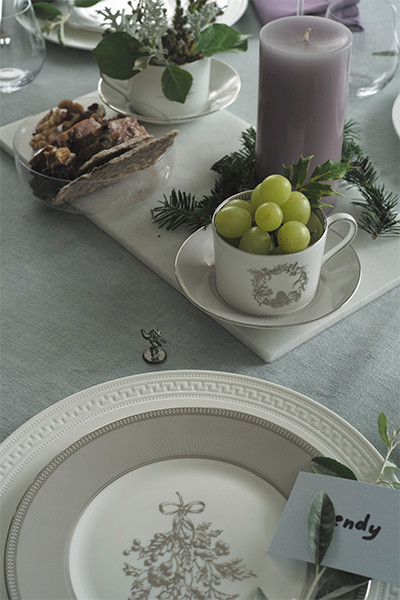 「クリスマス限定のウィンターホワイトの食器は、ホワイトとシルバーのモダンな色の組み合わせ。クリスマスツリーやリース、ヤドリギのスワッグなど、代表的なクリスマスモチーフが描かれたデザインですが、女性だけでなく男性でも使いやすいデザイン。一回り大きな皿に重ねてテーブルコーディネートすることで、ちょっとだけ改まった食卓の雰囲気が作れます。シンプルな色使いなので、テーブルクロスやナプキンで色を効かせて、自由にコーディネートできるのも楽しいですね。カップ&ソーサーは本来とは違う用途で、うつわとして、また花器として使っても。お料理が出てくるまでの、お酒とお喋りを楽しむ時間をイメージしてセッティングしました」