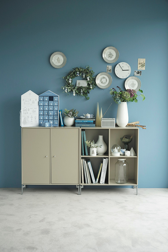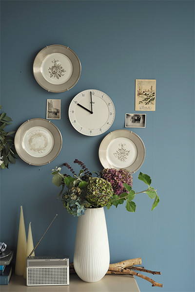 「食卓で使ったウィンター ホワイトのプレートを、ランダムに飾って壁をデコレーションしました。少し間隔をもってランダムに丸い皿を並べて、さらに時計をプラスして飾ることで、日常になじみやすくなります。ポストカードなどのピンナップで壁面を飾る感覚の延長で好きな皿を壁に飾ってみると、いつもとは違った楽しみ方ができます。クリスマスリースに、アドベントカレンダーのチャームを、毎日ひとつずつ足して飾るのもこの時季ならではの愉しみ。チェストと壁をちょっとだけ飾ることで、ツリーがなくてもクリスマスのムードが演出できます」