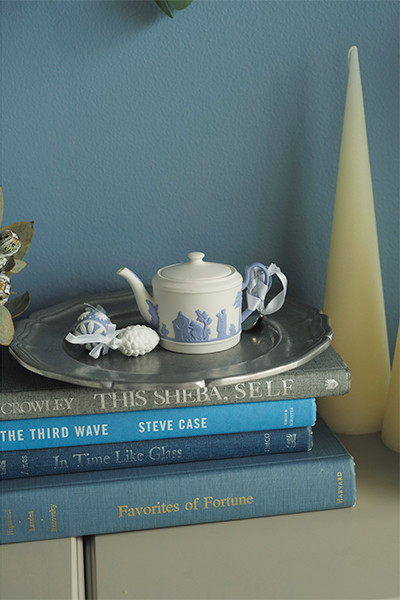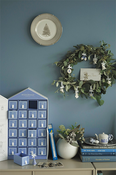 ホリデイ アドベントカレンダー2019(ポーセリンのチャーム24個付き/数量限定)¥71,500、シルバーのトレイに載せた260周年記念ホリデイオーナメント ティーポット2019(数量限定)¥4,950、壁に飾ったウィンター ホワイトプレート20cm(数量限定)¥4,400、ホワイトフォリア ベース (13cm)¥5,500/以上ウェッジウッド アドベントカレンダーに立てかけた本「MY ART BOOK OF SLEEP」¥2,783/ビブリオファイル モンタナ システムシェルフ  オープンタイプ¥85,360、扉付タイプ¥110,660/ともにアクタス その他/スタイリスト私物