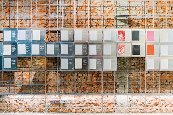 時を経て発見した赤煉瓦の壁に、台湾の上質な紙をディスプレイ。