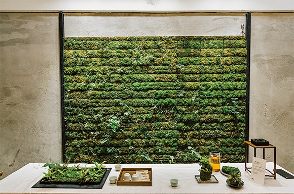 紙の可能性を探る取り組みとして苔と強化繊維で作られた壁は、水が自動循環して苔を育てる実験型アート。