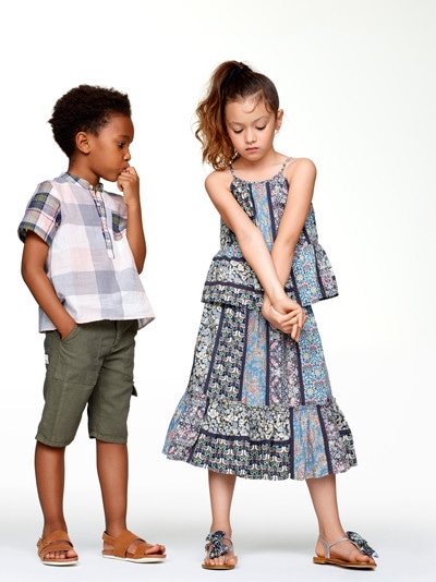 男の子:シャツ¥15,400~、ハーフパンツ(参考商品)、サンダル(参考商品) 女の子:キャミソール¥24,200~、スカート¥27,500、サンダル(参考商品)/以上ボンポワン