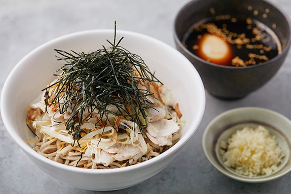 そばは時期により状態の異なるそばの実を全国から厳選、熟練の職人がそば粉を挽いて太打ちと細打ちを打ち分けている。豚バラ肉やネギ、モヤシなど具だくさんの人気メニュー「肉麻辣そば」¥1,100