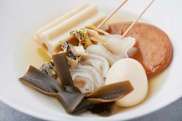 「AOBADAI料理長おすすめおでん盛り5種」¥1,100を熱燗や「出汁割り日本酒」とともに。おでん単品は¥275〜