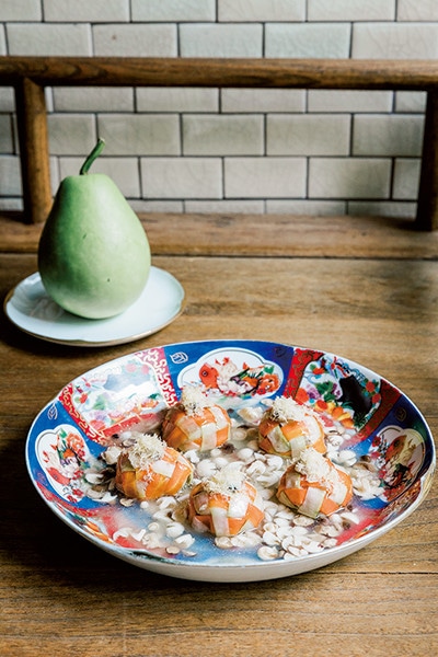 自家農場で有機栽培された蒲瓜とニンジンで黒豚やキノコを包んだ季節限定メニュー「蒲瓜封」880元