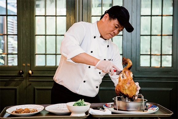 メインシェフを務める蔡瑞郎がテーブルで「掛爐燒雞」をさばく。