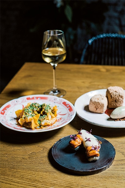 左から時計回りに、四川の紅油抄手風ワンタンにフォアグラソースを入れた「鴨肝和油封鴨肉餃、魚露、花生、白柚」680元、グラスワイン180元〜、シンガポールのカヤトースト風デザート「法式咖椰吐司、醬油焦糖、咖啡冰淇淋」320元、寿司を再構築したシグネチャー「海膽、海苔脆飯、柚子、紫蘇」880元