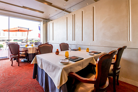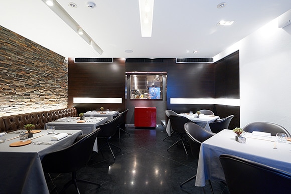 グレーのクロスがスタイリッシュな印象の店内。ガラスの向こうに厨房が透けて見え、ダイニングのエレガントさを保ちながらも心地よいライブ感が伝わる造り。